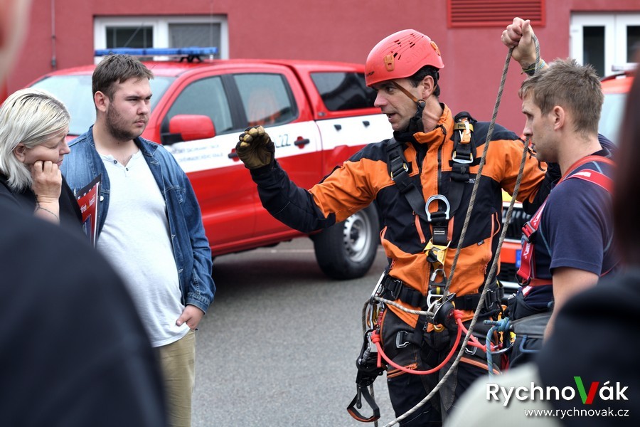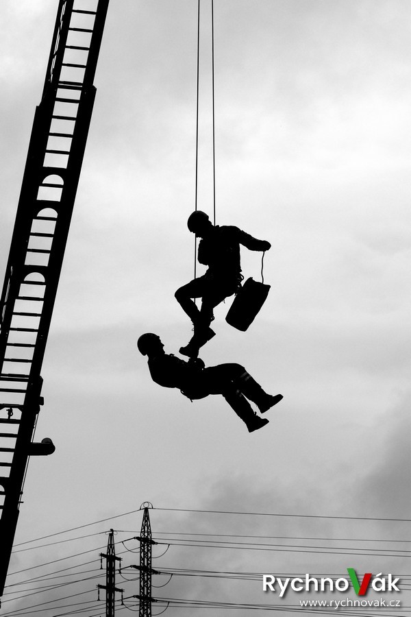 Třetí a závěrečná dynamická ukázka názorně předvedla slanění hasiče – lezeckého záchranáře ke zraněné osobě, která uvízla ve visu na laně, její následné zajištění k záchranáři a společné slanění na zem.