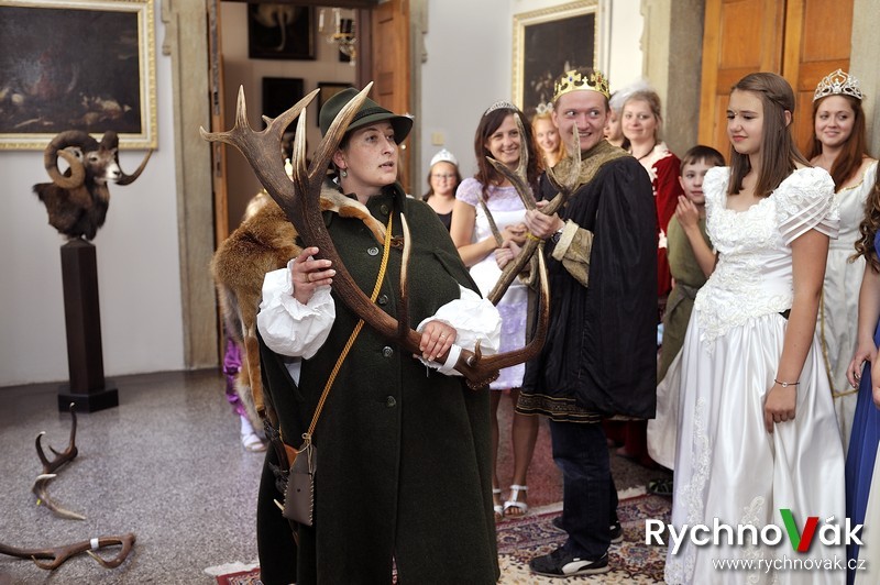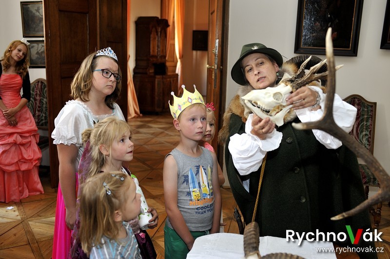 Druhé nádvoří klasicky patřilo projížďce na koních z jezdeckého klubu „ Na venkově“ ze Skuhrova nad Bělou a v Hladíkově síni se hrála pohádka „Princezna a Kašpárek “ od divadélka „BODI“ z Jaroměře. Hlavním bodem programu byla kostýmovaná prohlídka prostor zámku, kde rytíři i princezny poznávali pomocí průvodky v mysliveckém kostýmu historické předměty určení k lovu a určovali paroží, kožešiny,…. V zámecké kuchyni se dozvěděli něco o vaření a koření.